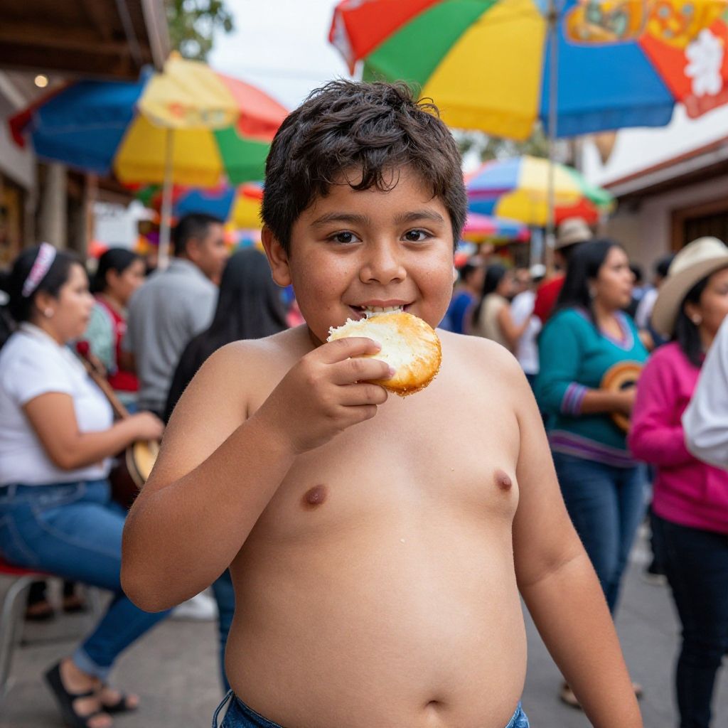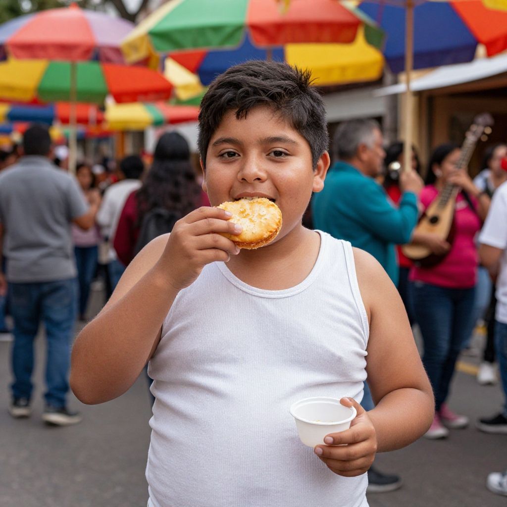 Obese Mexican kid eating street food at a bustling Mexican festival, vivid colors, authentic setting, smiling face, vibrant background with traditional music instruments