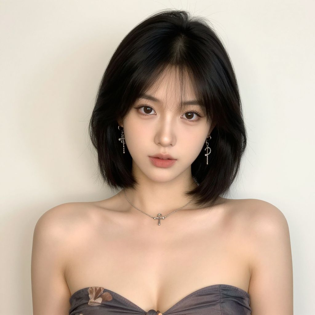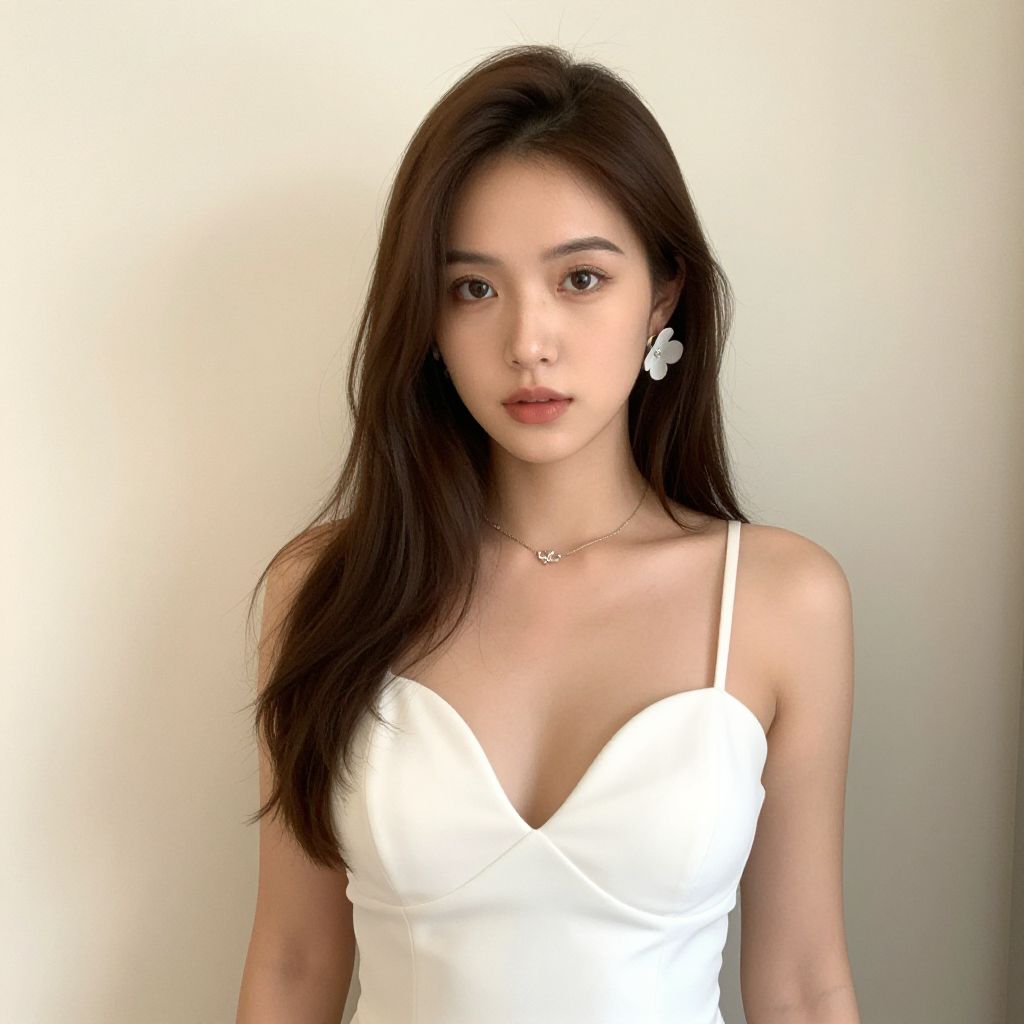 "groom stylish dress, 1girl, solo, dress, brown hair, white dress, breasts, jewelry, earrings, flower, realistic, long hair Realistic photo of casual sexy person with pretty face"