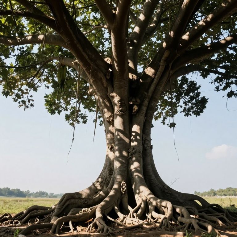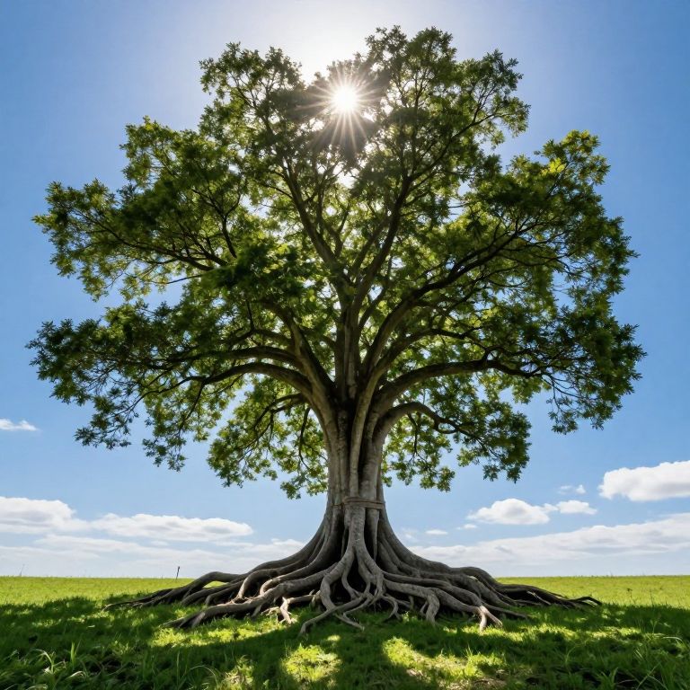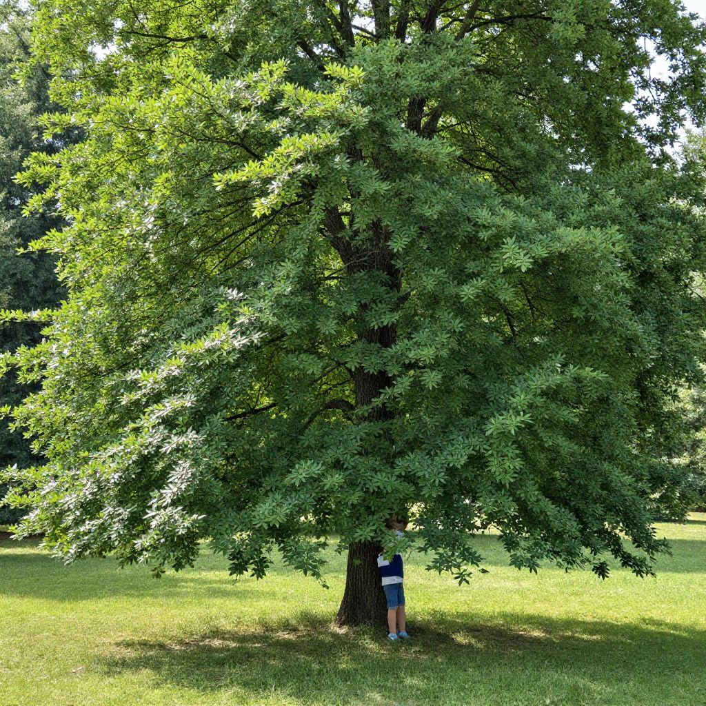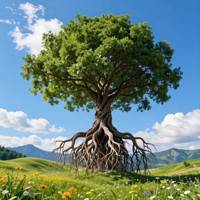 Emo huge tree in forest with a lot of leaves, mountains at background, flowers, high-quality, highly detailed, realistic, 8k photography,