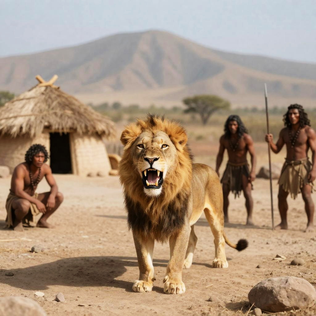 Silhouetted warrior crouches on cliff edge, facing snarling, large predatory creature. Warrior holds spear, backlighting by bright sky. Pyramid structures in background. Dramatic, low-angle perspective. Warrior's hair and backpack visible. Creature's sharp teeth and claws prominent. Intense, dynamic interaction.