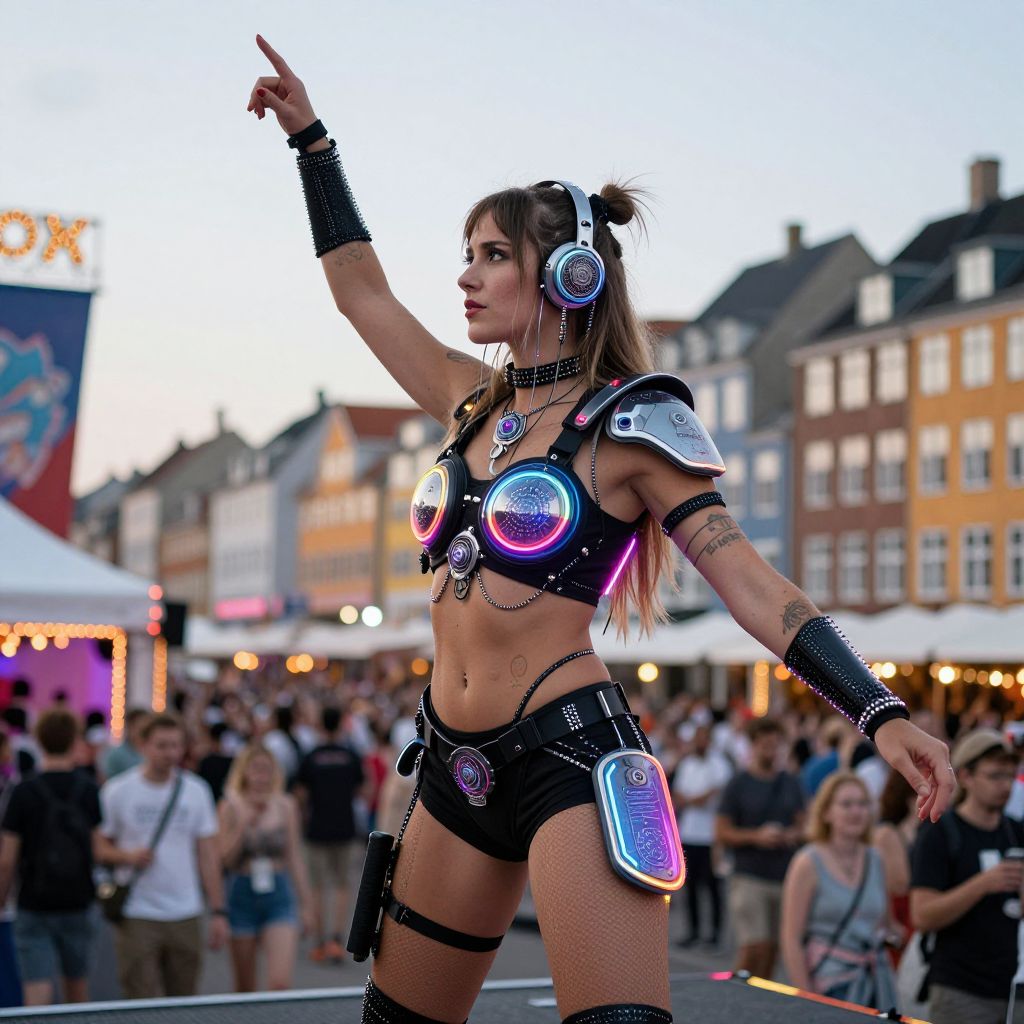 A beautifully detailed cyberpunk woman performs in a festival, adorned with intricate neon lights and wearing a revealing outfit, set against the backdrop of a vibrant cityscape in Denmark during summer 2022.