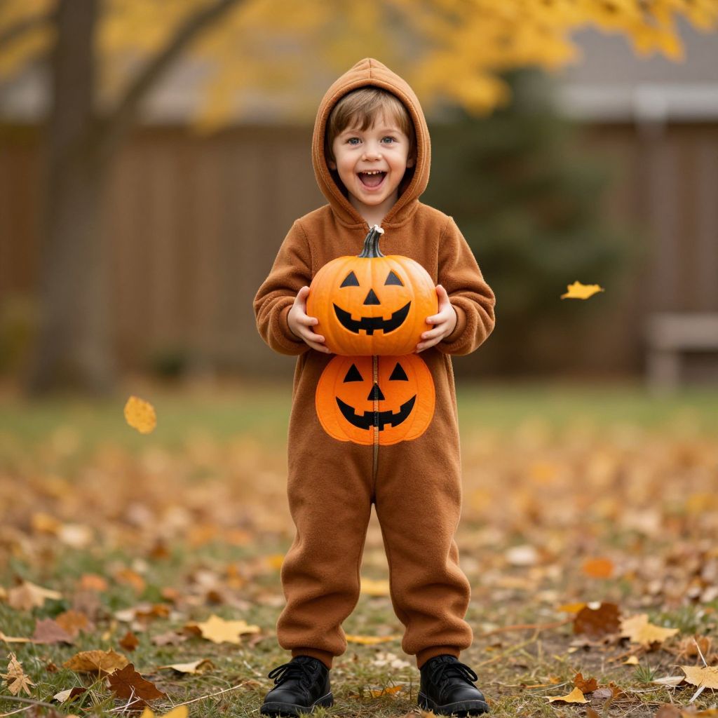 A cheerful young child, around 6 years old, is wearing a warm brown hooded outfit with a cozy zipper and a large, hand-painted pumpkin proudly displayed on the front. The child is holding a similarly styled pumpkin in their hands, their eyes bright with excitement and a smile playing on their lips. They are standing in a gently lit autumn backyard, with golden leaves swirling in the breeze, and are wearing black, sturdy shoes that add a touch of contrast to the earthy tones of their outfit. The scene captures a joyful, festive atmosphere during a Halloween-themed day.
