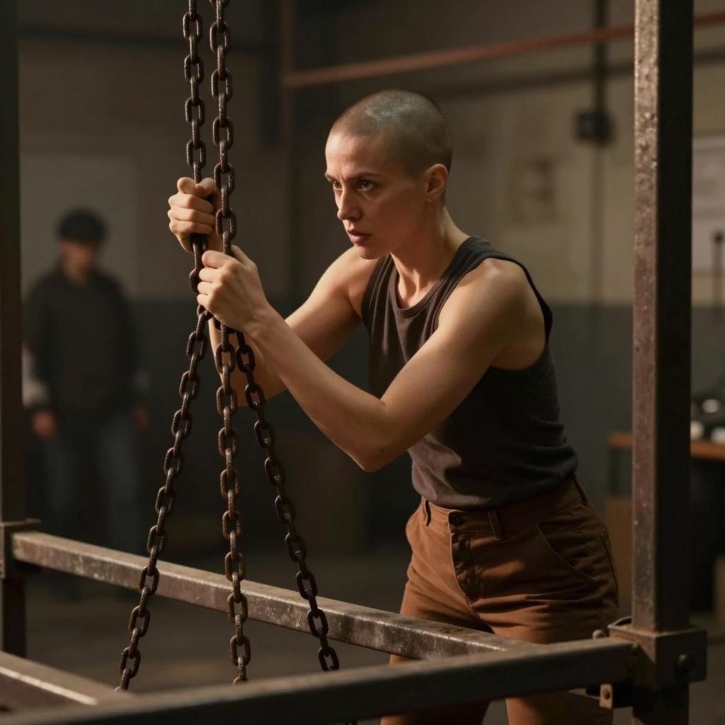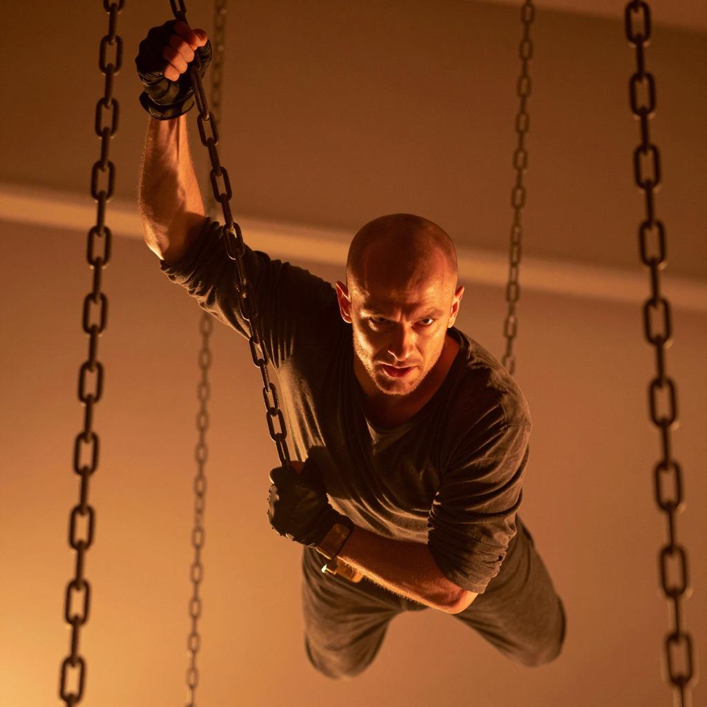 A muscular man with a shaved head and intense expression is suspended by chains in a dimly lit, smoky room. He wears a dark, heavy jacket and black gloves, hunched forward with arms bound behind him. Multiple chains hang in the background. The lighting creates strong shadows and highlights.