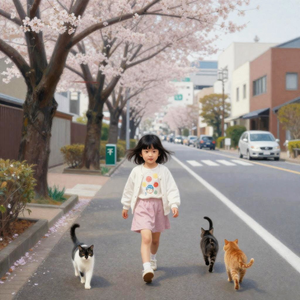 Realistic photo.playful young girl in Tokyo, walking with her two cats, beautiful black-haired, springtime street scene, professional impressionist painting, inspired by Yayoi Kusama, Takashi Murakami, long shot. realistic photo