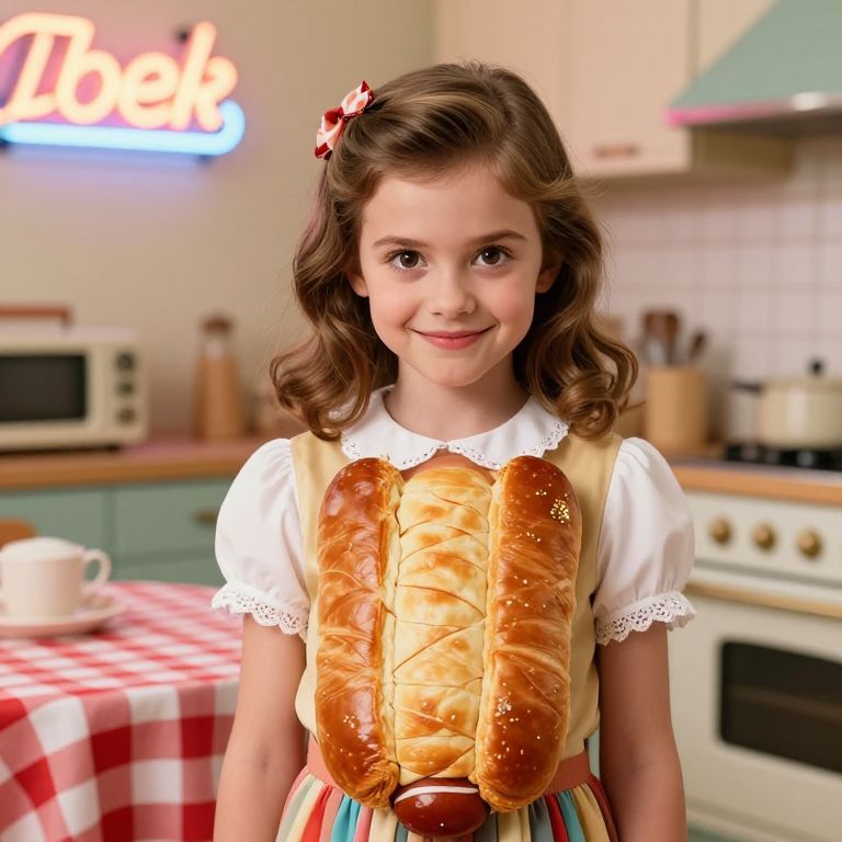 A young girl aged around 10 with big brown eyes and a slightly mischievous grin dressed as a vintage-style sausage roll fancy dress, complete with textured pastry skin, a small golden crinkle on the side, and lace trim, standing in a retro 1950s-style kitchen with a neon sign and a checkered tablecloth in the background.