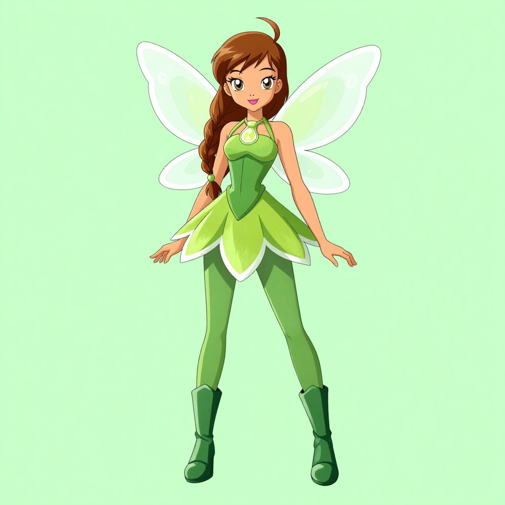 Green winx costume, 1girl, solo, wings, pantyhose, brown hair, green dress, dress, braid, fairy wings, full body, fairy, boots, long hair
