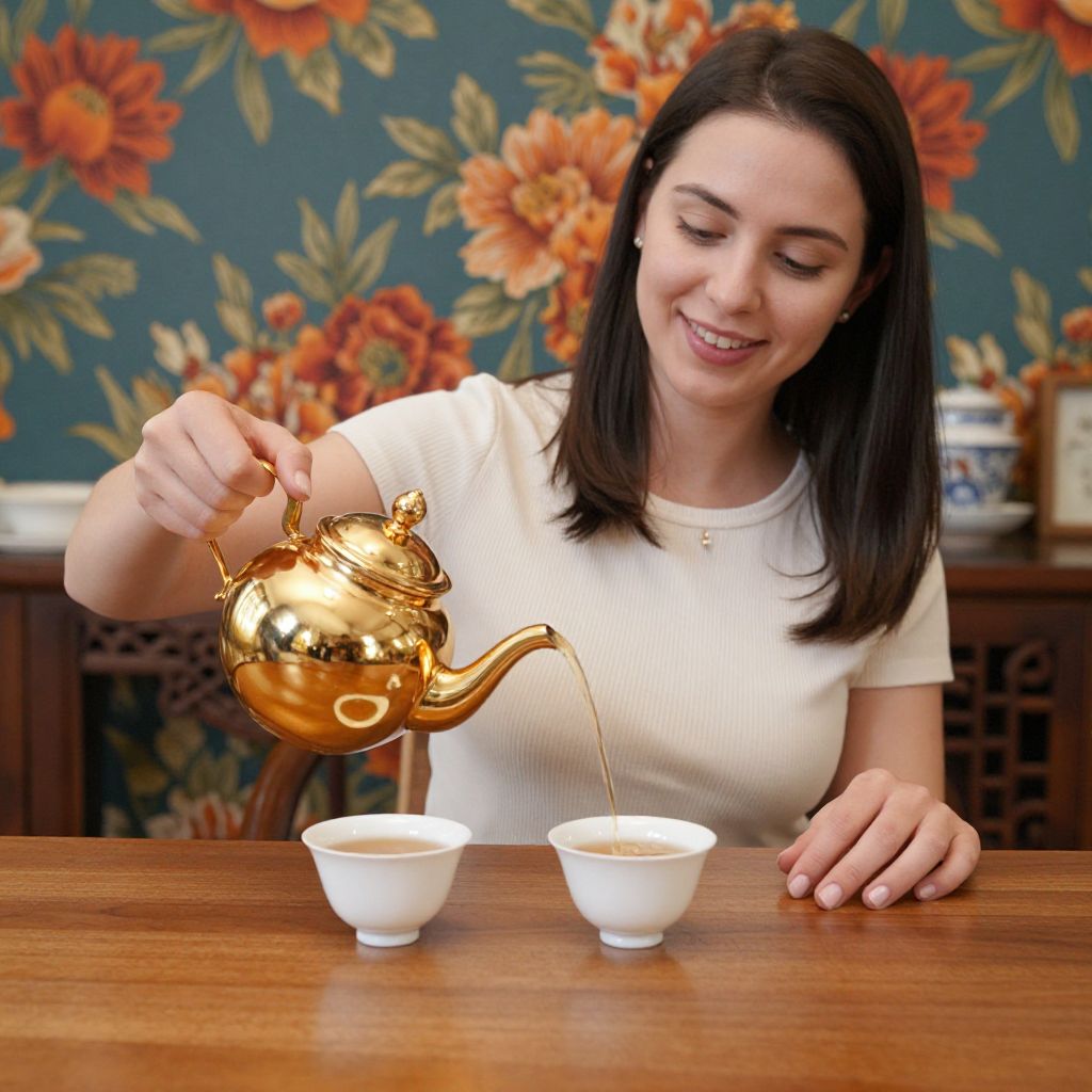 Woman enjoying a serene tea moment, gracefully pouring from a golden teapot onto a wooden table adorned with two delicate white cups filled with amber tea, set against a vibrant floral wallpaper backdrop.