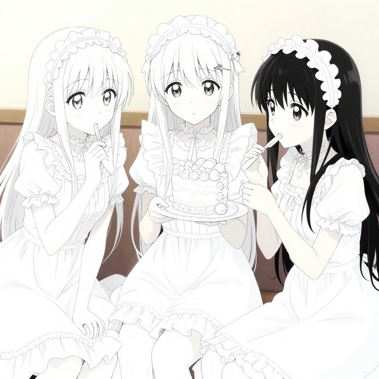 Line Drawing high school of the dead anime girls playing with cream and cake wearing frilly white lingerine,