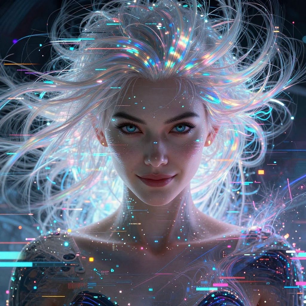 Extreme Cyberpunk Adult Aesthetic, mixed with Glitch-core style mixed with pixel dissolving style, areal vortex and mystical epic wind, dissolving body, glowing energy.Accurate and detailed and serious and dramatic portrait of "Ms. Baker".Intense eyesight, subtle smile, stares the viewer.Glitchy, bio-luminescent, iridescent, glowing hair.Hair are made of glowing iridescent optic fibers.Upper body is visible.Glowing multi-color piercings are present.Pristine Aesthetic.Life-like details.Cinematic. Dramatic. Dynamic. Ironic.Extremely refined lines and and shapes.Extremely refined details on objects.Sharp details.Wide range of colors.Many details everywhere. Ray-Tracing. Anti-Aliasing. Realistic soft shadows. Low saturation colors. Insane quality. Insane resolution. Insane details. Masterpiece. 32k resolution.