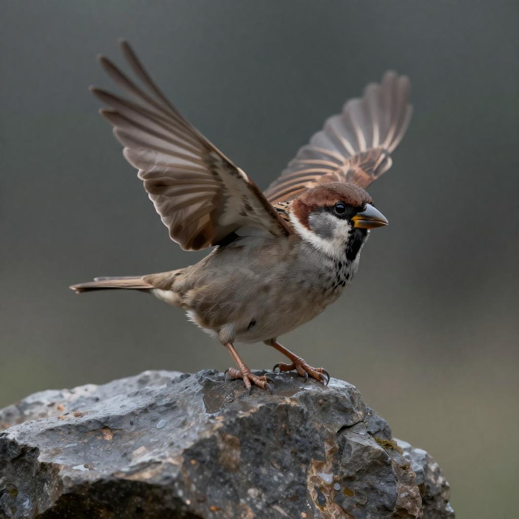 Digital illustration of a small brown sparrow with wings partially spread, perched on a gray rock. Dark, misty background. Sparrow's beak slightly open, eyes focused forward. Raindrops visible. Rock ure detailed. Sparrow centered on rock.