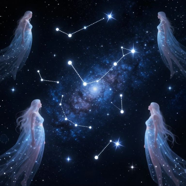 Digital art depicting four ethereal, blue-lit, ghostly figures with long, flowing hair, standing in a starry night sky. The figures, glowing with a soft blue light, face different directions. A constellation of bright stars is connected by dotted lines, forming a pattern at the center. The background is a deep black, speckled with tiny white stars, adding depth and contrast. The figures' translucent robes blend with the cosmic theme, enhancing the mystical, celestial atmosphere. The overall style is dreamlike and otherworldly.