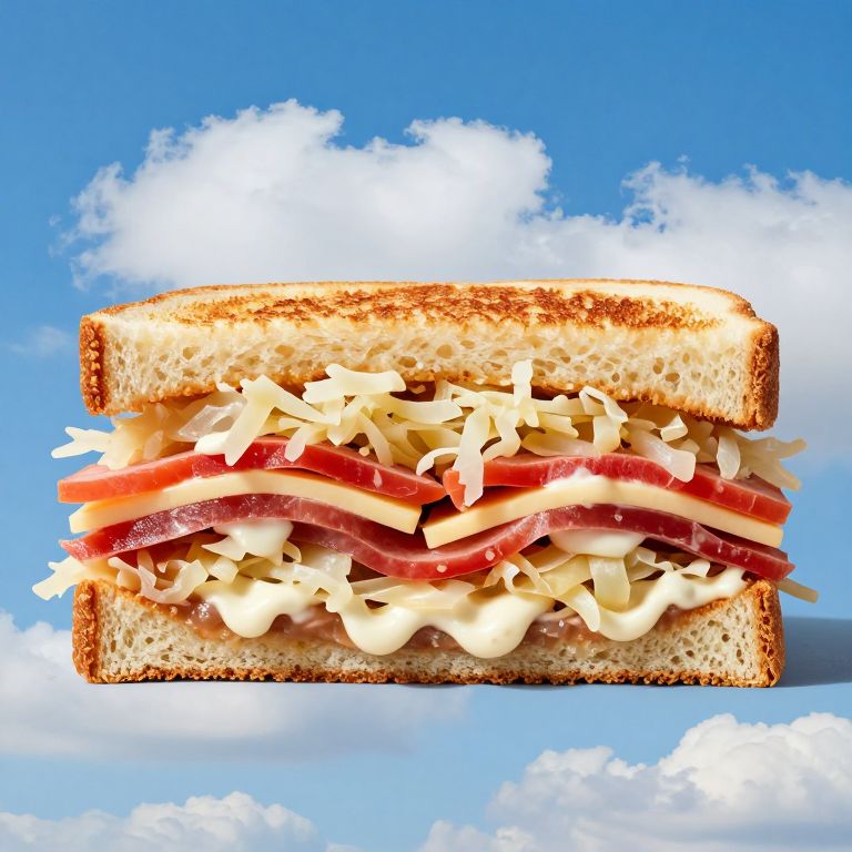 The image presents a stylized, wide-angle view of a delectable reuben sandwich, revealing its cross-sectional layers in a visually striking manner. The sandwich is composed of two slices of toasted bread, with the top slice slightly tilted, showcasing the interior. Inside, the layers are meticulously arranged, featuring alternating slices of red and white cheese, along with layers of sauerkraut and Thousand Island dressing. The sauerkraut is finely shredded, providing a contrasting texture to the smooth, creamy dressing. The sandwich is set against a backdrop of a clear blue sky with fluffy white clouds, creating a striking contrast with the rich, colorful layers of the sandwich. The overall composition is balanced, with the sandwich centrally positioned, and the sky occupying the upper portion of the image, emphasizing the sandwich's layers and textures. The lighting is bright, highlighting the vibrant colors and the detailed textures of the sandwich's components, making it appear appetizing and inviting.