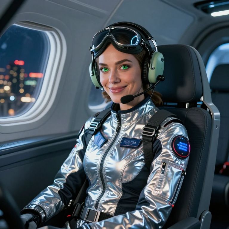 A realistic cinematic shot of a female pilot in a futuristic pilot outfit made of reflective materials and high-tech fabric, sitting in the cockpit of a jetliner with windows showing a city skyline at night. She has bright green eyes, a strong nose, and a warm smile, wearing a headset and a flight goggles, in a sleek, high-tech aviation interior.