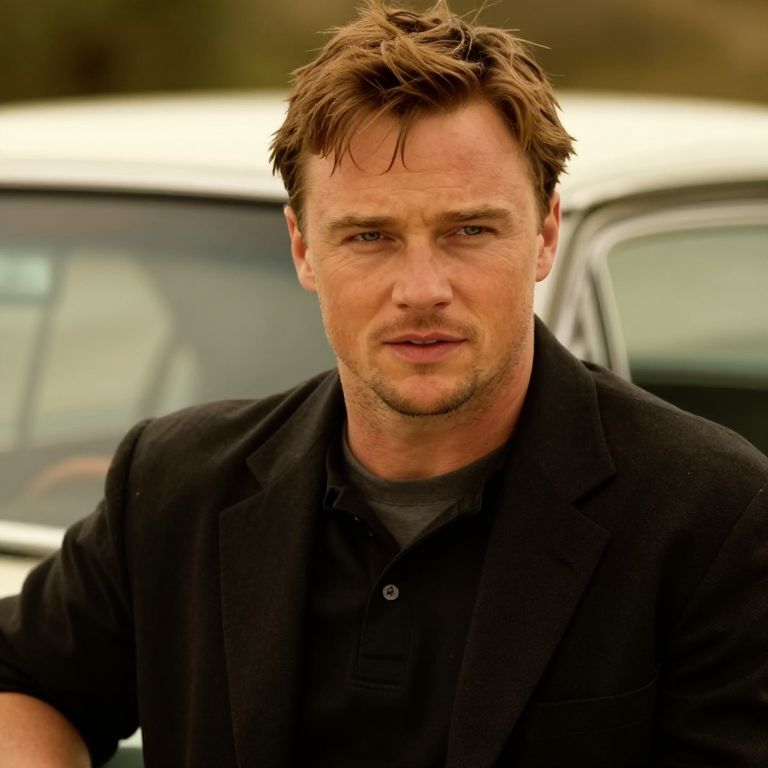 Brendan Fraser young, classic movie hero style, rugged charm, slight stubble, vintage car background, warm tones, soft cinematic lighting