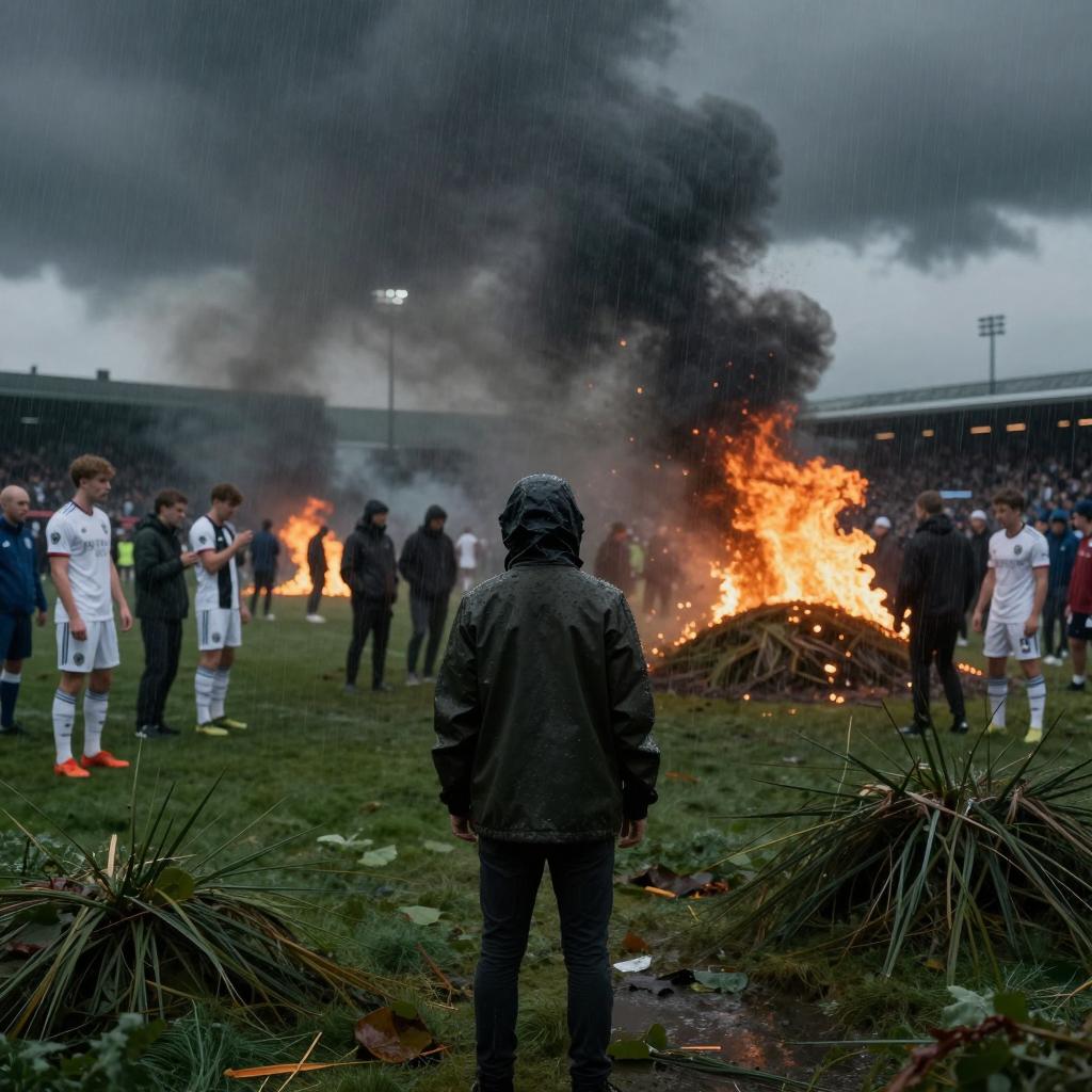 A burning red car on a wet street at night. A man in a dark suit with short, dark hair stands with his back to the camera, leaning on a wrought iron railing. Flames and thick smoke rise from the car. Other people are in the background on the right. The street reflects the firelight.