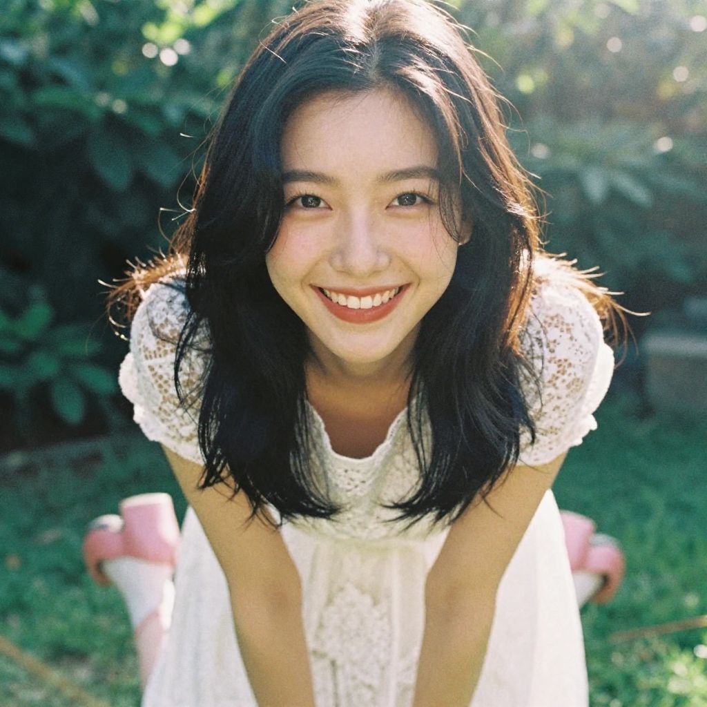 BlakeL_SoloTI_v1, PA7_Portrait-MS, (smile, teeth:1.3), (modern photo, A white lace dress, paired with pink high heels, for a sweet and feminine look:1.1), closeup portrait, 85mm, (analog, cinematic, film grain, hazy atmosphere:1.3), ((A garden in the afternoon, with sunlight shining through the leaves:1.2)), detailed eyes, (painted lips), (seductive), (cinematic shot:1.3)