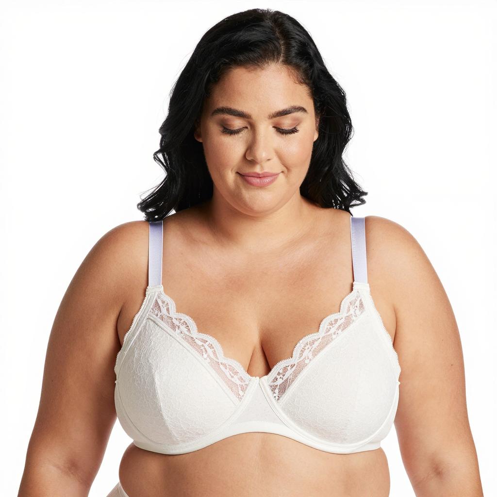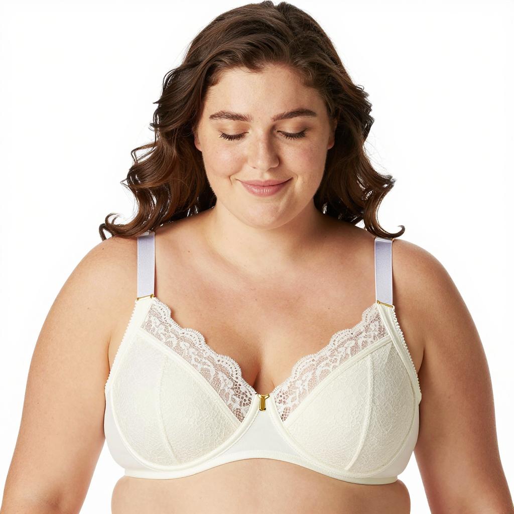 Photograph of a woman with light skin and dark brown hair, smiling. She wears a beige lace bra with a front zipper. Her breasts are large. She is centered, facing forward. Background includes a white vase on a shelf.