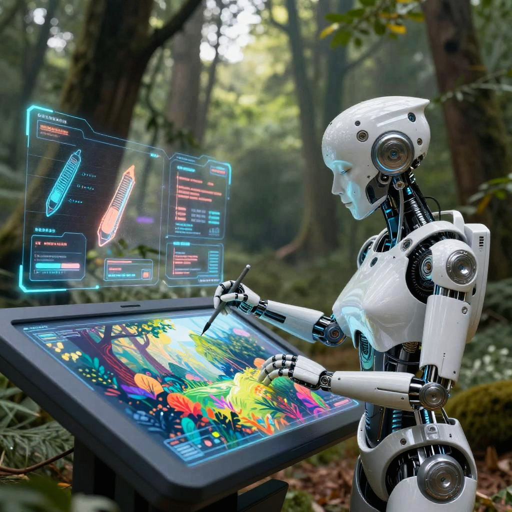 An AI illustrator in a futuristic cybernetic body, painting a colorful digital forest scene on a transparent touchscreen display, surrounded by holograms of artistic tools and augmented reality effects, blending natural beauty and advanced technology in a vibrant style
