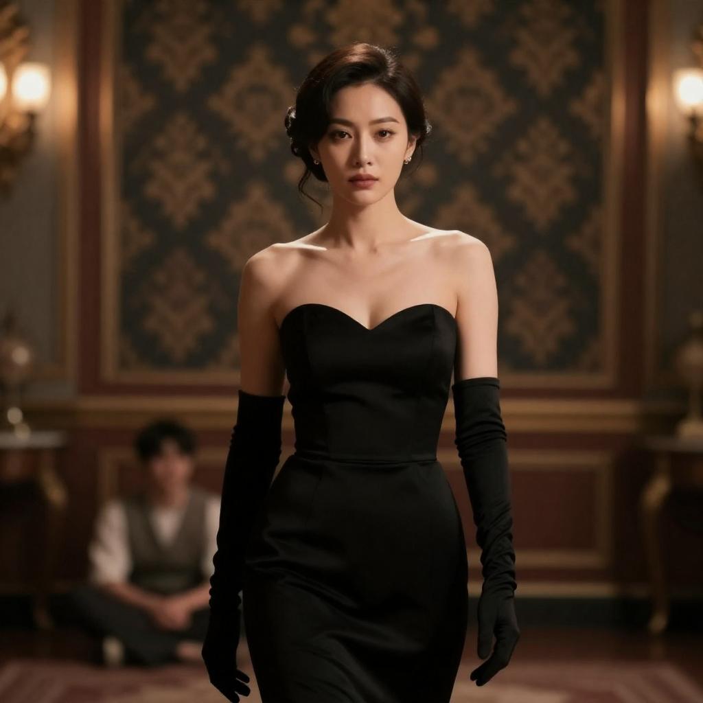 A glamorous lady from the 1930s, adorned with sapphire necklace and Art Deco brooch, stands gracefully in a lavish setting.