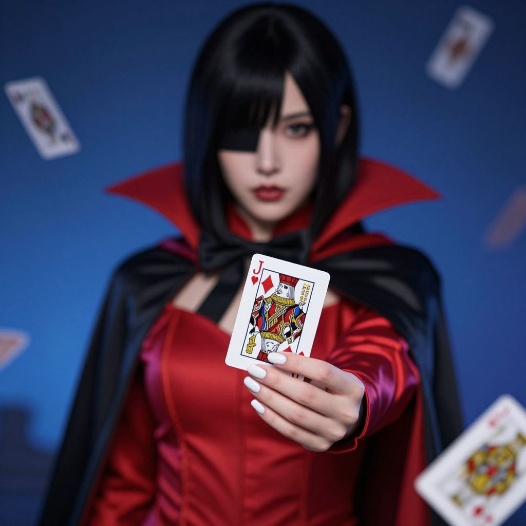 A hyper-realistic digitally drawn portrait of a young woman in a vibrant red magician's outfit, featuring a black bowtie and a dramatic red and black cape, Her straight, jet-black hair with sharp bangs partially frames her face, though her expression is obscured in soft blur, Her right hand extends toward the viewer, holding a vividly detailed \"Jack of All Trades\" playing card, The card and her hand are in sharp focus, showcasing her glossy white-manicured nails, which contrast beautifully with her dark attire, The rest of her face and body fade into a blurred haze, with only the card and hand remaining clear, creating a dynamic visual contrast, The background is a soft, blurred gradient of deep blue, illuminated by cinematic lighting that adds a mysterious, ethereal glow, Floating playing cards drift in the blurred backdrop, subtly hinting at movement and depth, The satin-like texture of her costume catches the light, revealing a smooth, luxurious sheen, while the lighting highlights the sharp details of her hand and card, The scene blends the allure of classic magic with modern cinematic storytelling, evoking mystery and elegance, flawless anatomy, cinematic focus blur, digitally drawn