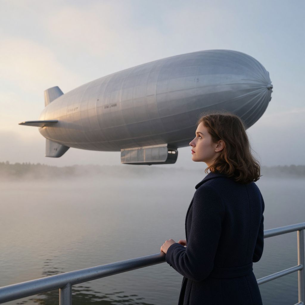 A large, sleek silver airship floating slowly above a quiet misty lake at dawn, with soft golden sunlight filtering through the clouds; a young woman with kind eyes and brown hair wearing a navy wool coat stands on the observation deck, looking out at the horizon with curiosity and wonder.