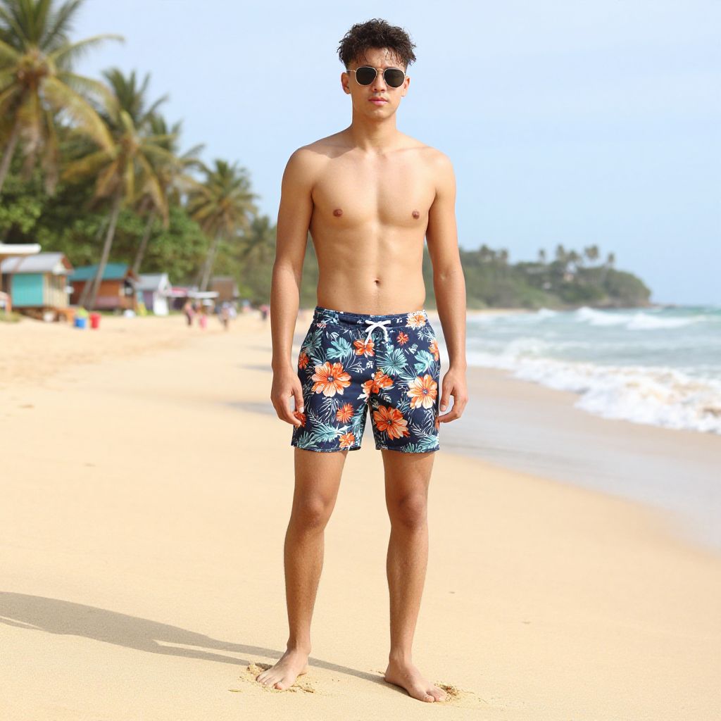 A young man stands confidently on a sandy beach, exuding summer vibes in vibrant floral swim trunks. The tropical backdrop features beach huts and ocean waves, embodying a relaxed and adventurous spirit.