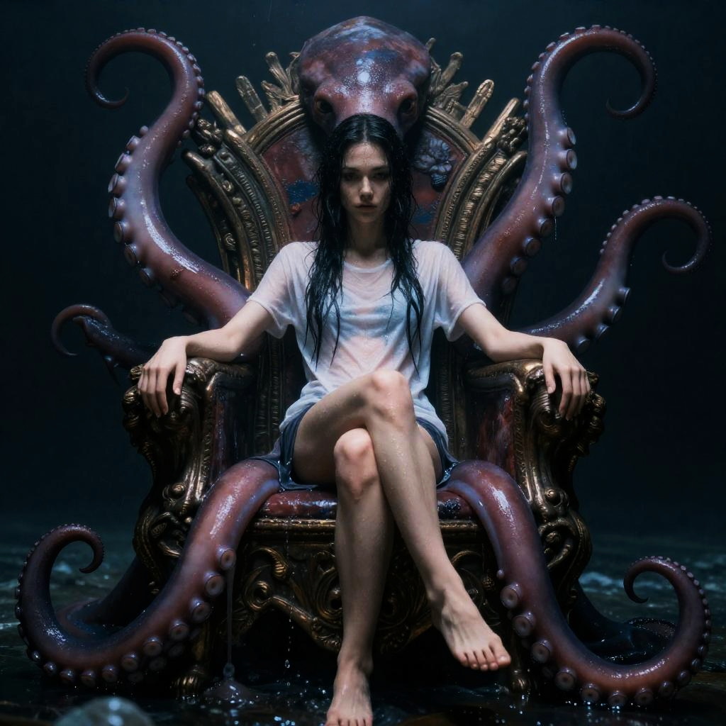 Nsfw, best quality, masterpiece, ultra high res, (photorealistic:1.3), 8K, raw photo, 1girl, full body, queen, sitting on a throne, fashion, (surrounded by tentacles:1.2), octopus, slime, drool, wet, cum, wet hair, tentacle porn, poseidon, fucked by tentacle, wearing wet t-shirt, wet clothes, water, film grain