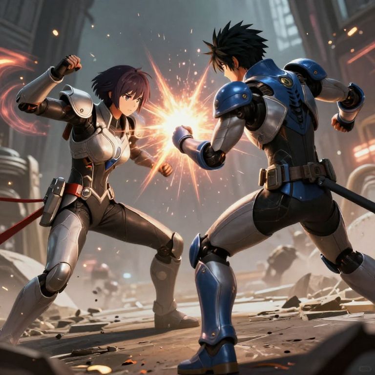 Anime AI art portraying an intense battle between two AI-enhanced warriors in a dystopian setting, dynamic action poses, sparks and energy blasts illuminating the scene, strong shadows and highlights, realistic textures blended with stylized anime features.
