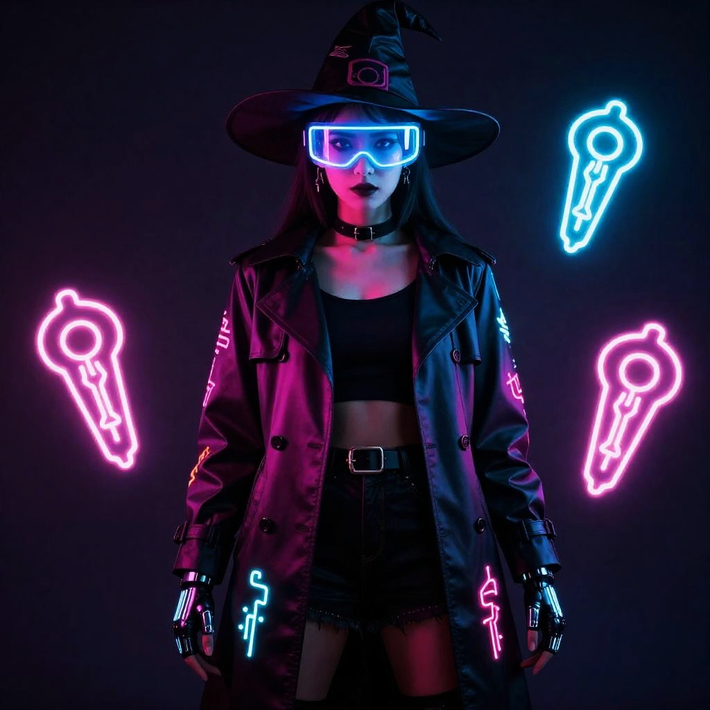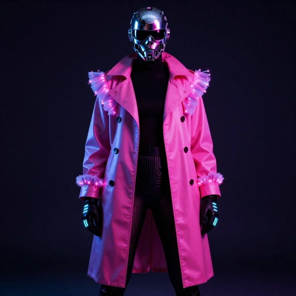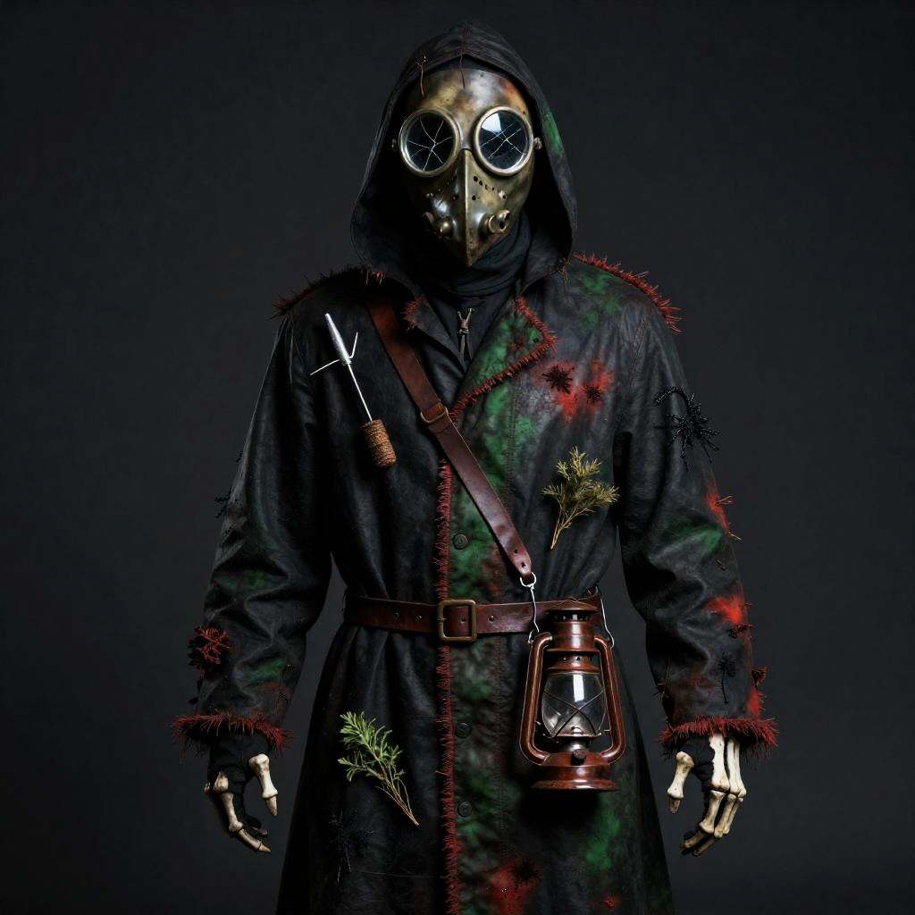Halloween outfit, worn by ghoul with glowing eyes, featuring skeleton jumpsuit with LED mask, in shades of green and black.