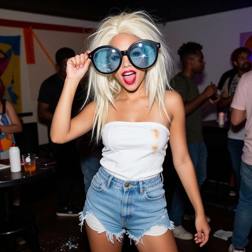 Photograph of a blonde woman with long, platinum hair, wearing oversized black sunglasses, a white strapless top, and frayed denim shorts. She has bright red lipstick and is playfully sticking out her tongue while adjusting her sunglasses with her right hand. The background features a dimly lit room with several people, including a man in a black shirt and another in a white t-shirt, engaged in conversation. The walls have colorful abstract artwork. The image has a high-contrast, vibrant color style, emphasizing the subject's bold appearance against the darker, more subdued background.