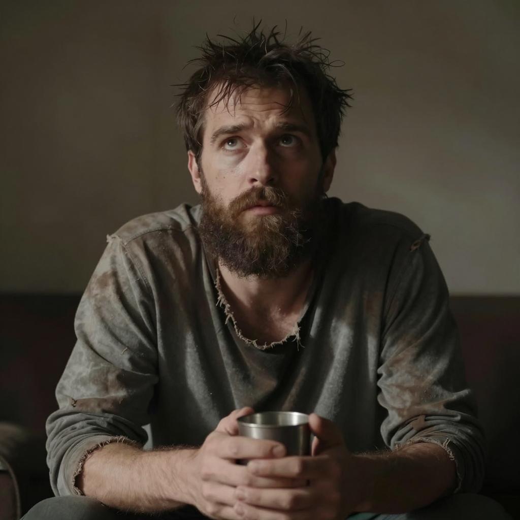 Photograph of a middle-aged man with messy blonde hair and beard, blue eyes, and a distressed expression. He wears a tattered brown cloak over a white shirt. Background includes a gray concrete wall and straw on the floor. He leans forward, looking to the left. Single person.