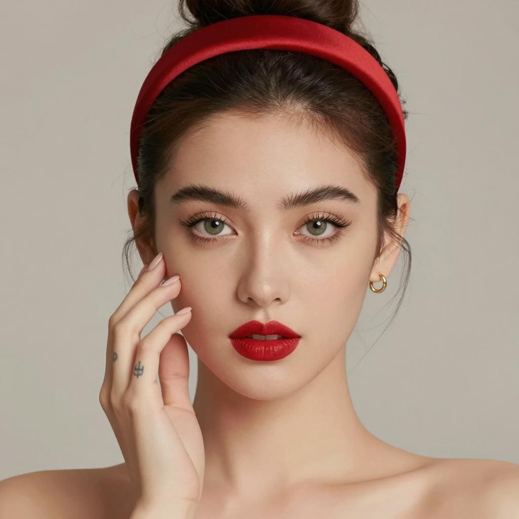 Close-up photograph of a fair-skinned woman with brown hair and blue eyes. She has red eyeshadow, thick red lipstick, and slightly freckled skin. She rests her cheek against a red, ribbed fabric. Her eyelids are partially closed, with black eyeliner extending outward. The dark background emphasizes her facial features and makeup.