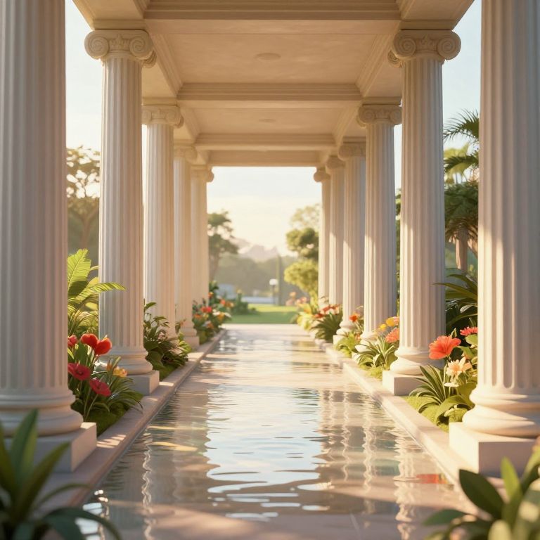 A serene 3D-rendered pathway of classical columns flanked by vibrant flora and mirrored water creates a dreamlike corridor, where the interplay of golden-hour lighting and reflective surfaces invites contemplation of hidden truths and whispered secrets.