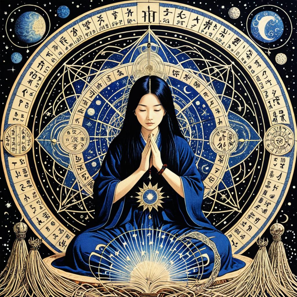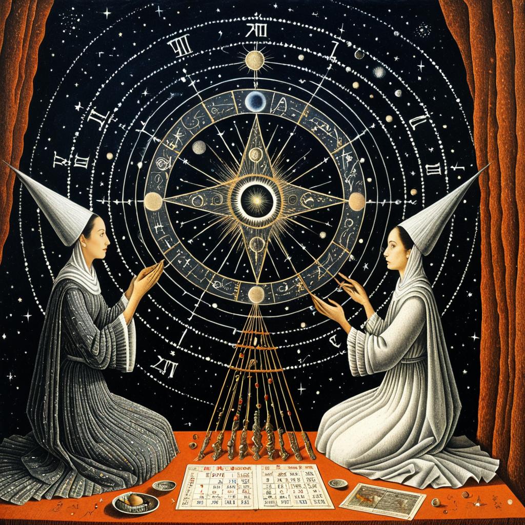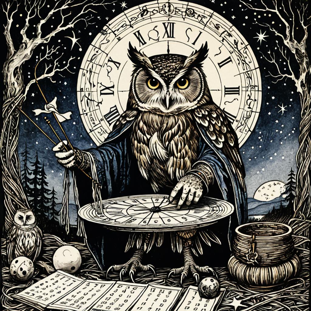 Fantastical, art by Arthur Rackham, enchanted owl weaving fate threads, adjusting the fortunes and misfortunes of time and space, rituals, spells, calendars, celestial motifs, woven textiles