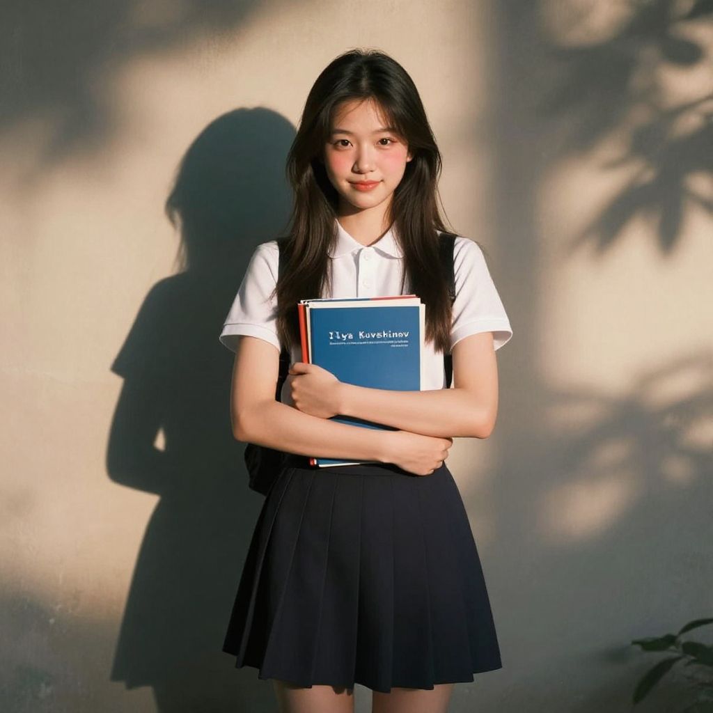 "Ilya Kuvshinov" style.Hyper-Stereotypical 90' high-school 18yogirl in educated outfit, stunning, beautiful, long hair, medium skirt, white polo shirt, super shy, super cute, blushing, looking at the viewer while holding school books with both arms.Looking at the viewer while smiling.Looking at the viewer while smiling.Looking at the viewer while smiling.Looking at the viewer while smiling.Looking at the viewer while smiling.AsianDusk.Long shadows.By "Simon Stalenhag".Life-like details.Cinematic. Dramatic. Dynamic. Extremely refined lines and and shapes.Extremely refined details on objects.Sharp details.Wide range of colors.Many details everywhere. Ray-Tracing. Anti-Aliasing. Realistic soft shadows. Low saturation colors. Insane quality. Insane resolution. Insane details. Masterpiece. 32k resolution.