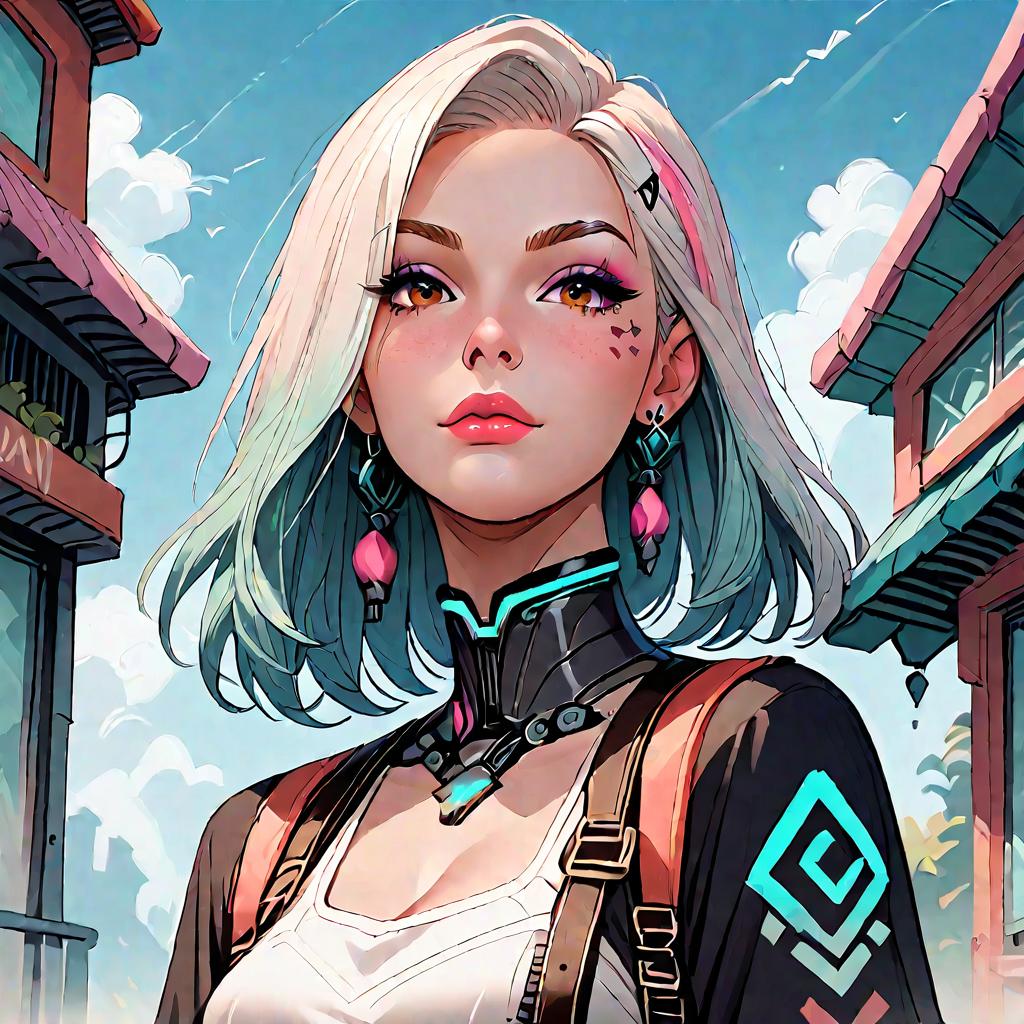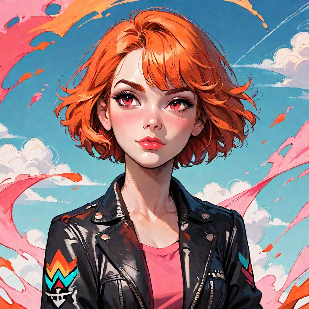 Score_8_up), score_7_up, score_6_up, close up, portrait, 1girl, solo, woman, loisgriffin, orange hair, black leather jacket, pink tanktop, flat, source_cartoon, toon style