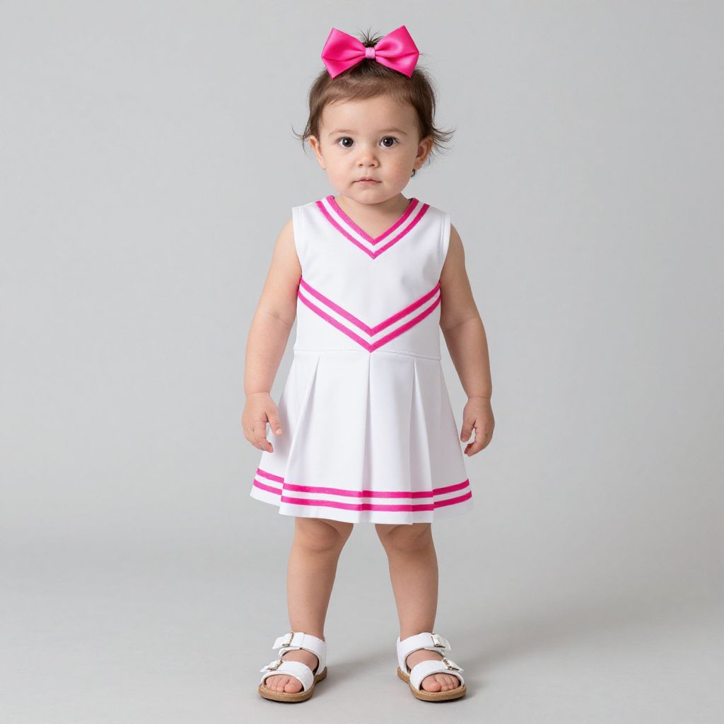 Newborn cheerleader outfit, solo, 1girl, bow, realistic, brown hair, sandals, pink bow, child, hair bow, dress, standing, full body