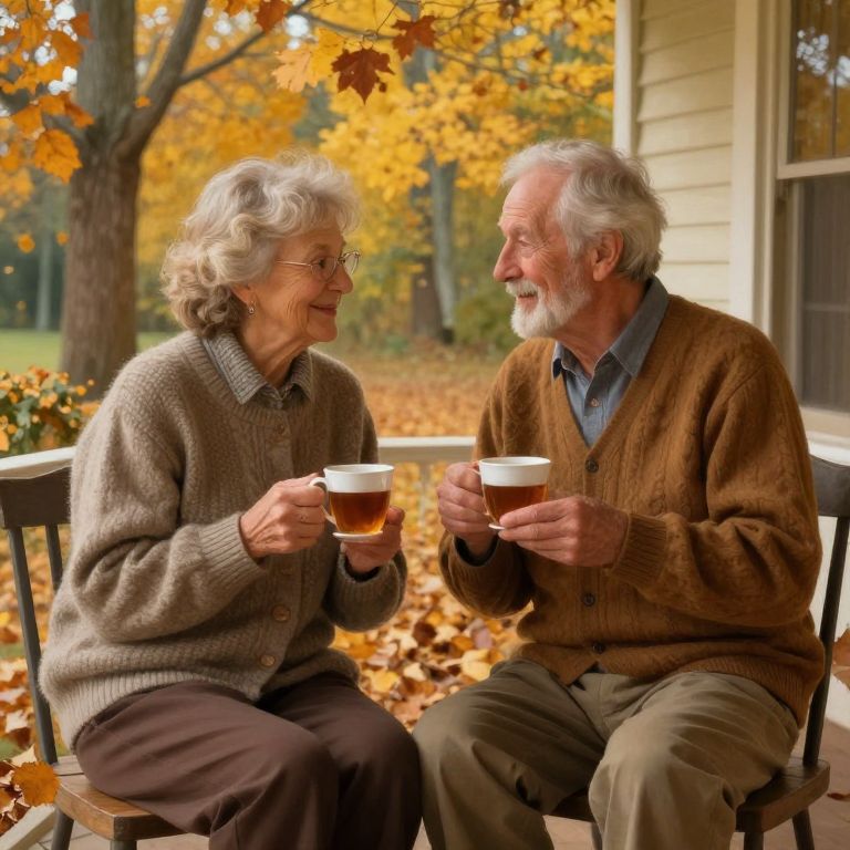 Photograph of an elderly couple sitting on a wooden porch during autumn. The woman with short, curly white hair, glasses, and a gray knit sweater, holds a coffee cup in her right hand. The man, with a white beard and gray hair, wears a brown sweater over a blue shirt and also holds a coffee cup. They sit on wooden chairs, smiling at each other. The background features a house with cream-colored siding, yellow and orange autumn leaves, and a tree. The scene exudes warmth and nostalgia.