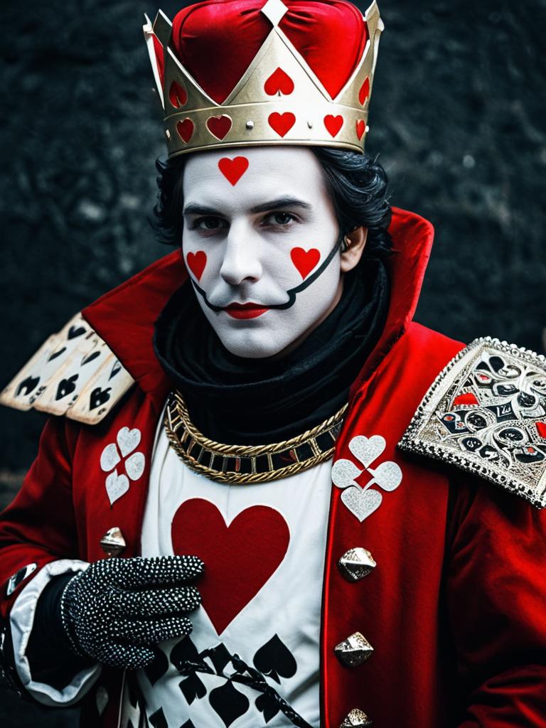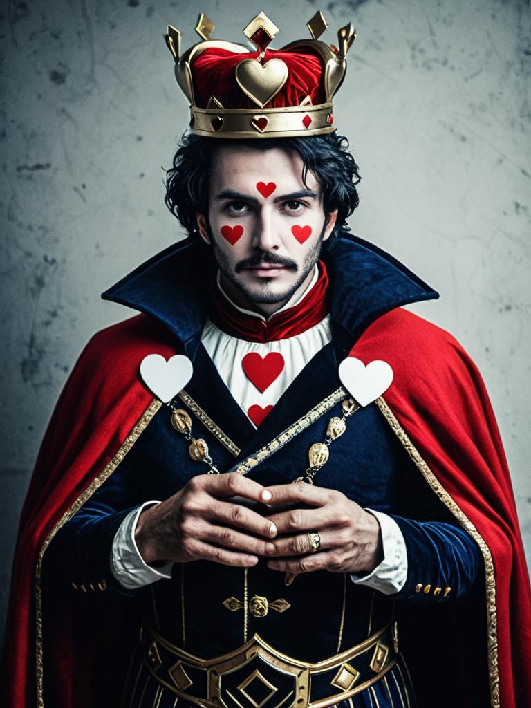 Man in King of Hearts Costume, photorealistic fantasy cosplay portrait, cinematic realism