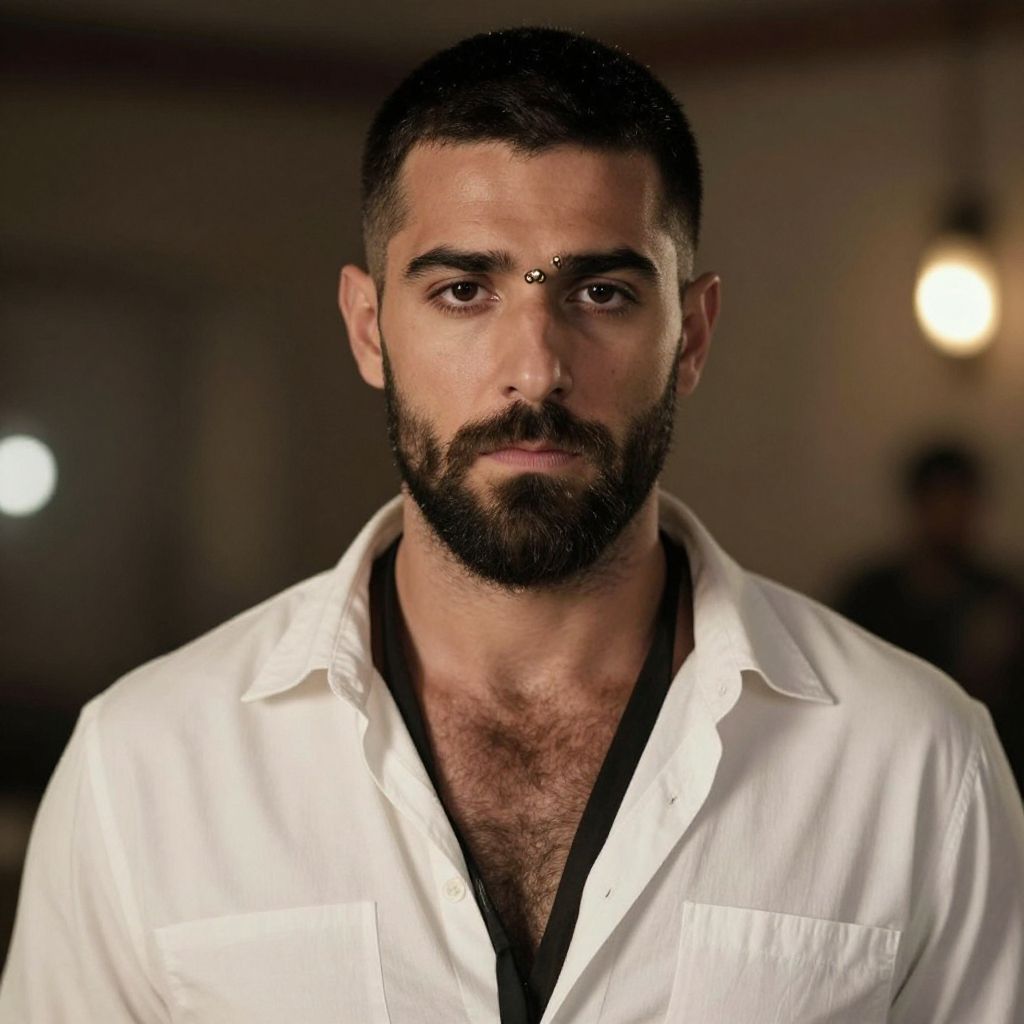 Photograph of a bearded Middle Eastern man with short, dark hair and intense dark eyes, gazing directly at the camera. He has a medium build and a hairy chest visible through an unbuttoned white shirt. The background is blurred, with indistinct warm lighting, suggesting an indoor setting. His expression is serious and slightly stern, with a small mole above his left eyebrow. The image is sharp with a shallow depth of field, focusing on his face and upper body.
