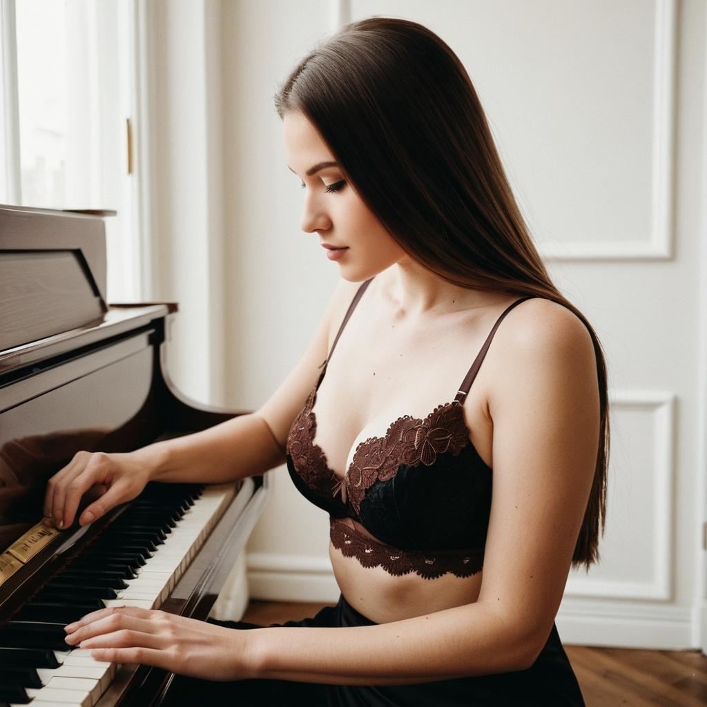 Intimate lifestyle portrait of a woman playing the piano, light-brown–haired woman with sleek straight hair tucked behind one ear, seated at a white grand piano, wearing an elegant dark chocolate lace bra with embroidered floral motifs bra with delicate straps, shoulders turned three-quarters toward the viewer, focused expression as her fingers rest on the keys, soft natural light from a nearby window, creamy neutral background, high-end lingerie editorial photograph