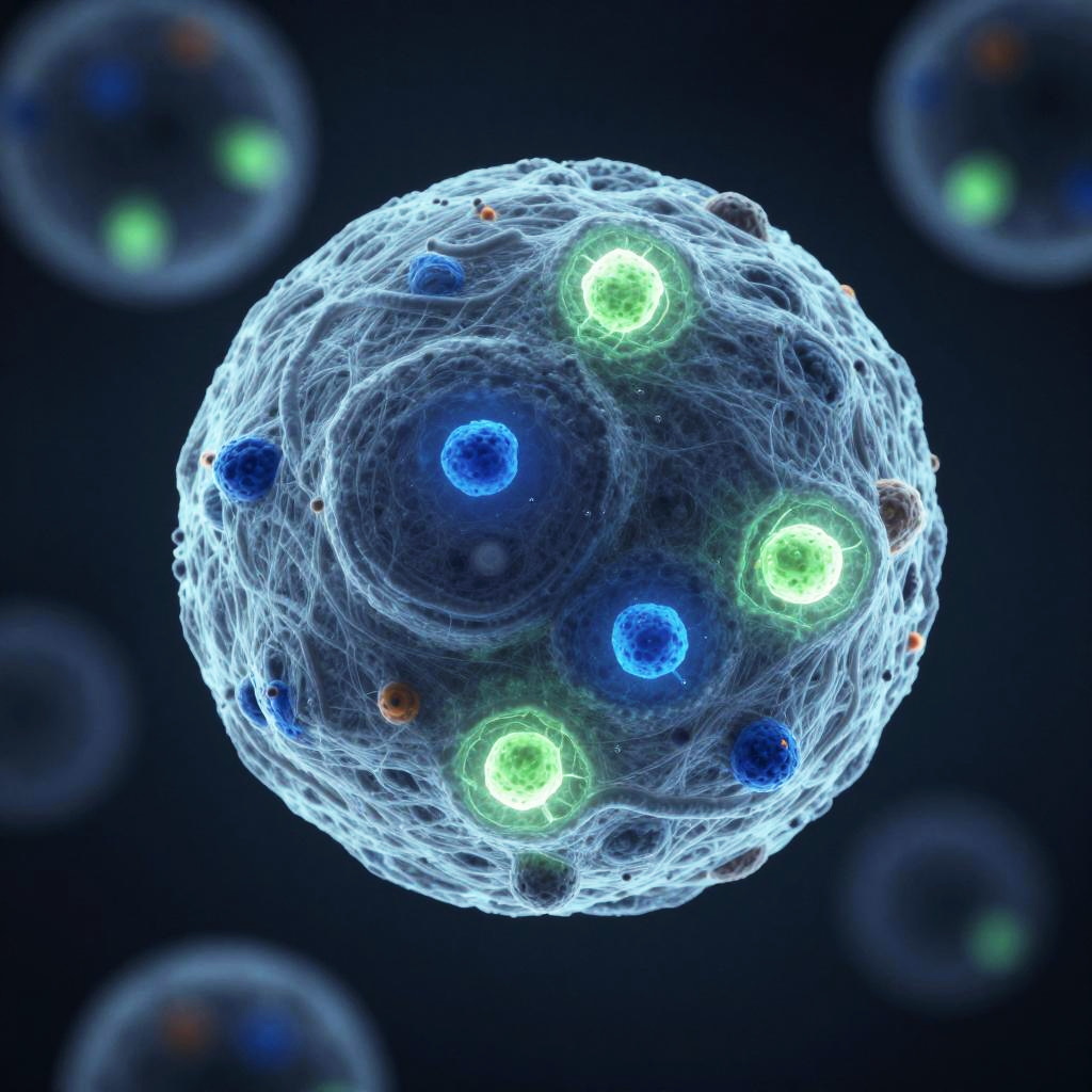 Imagegfap, a microscopic view of astrocytes stained with fluorescent markers, glowing faintly with blues and greens, set against a dark scientific backdrop, mixing realistic cell textures with artistic lighting effects