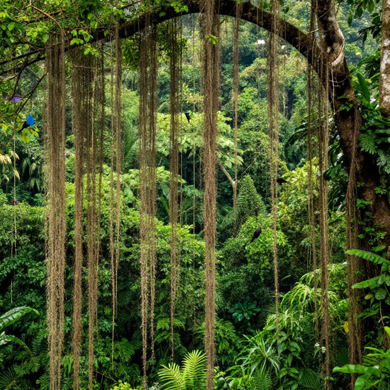 A panoramic view of rainforest with numerous lianas hanging from tall trees, vibrant foliage in various shades of green, wild natural habitat with exotic birds perched on vines, dynamic composition, rich color palette