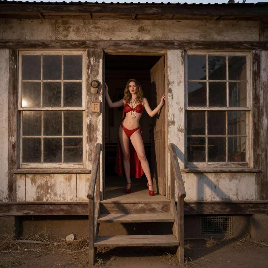 Photograph of a woman with curly brown hair standing in the doorway of an old, weathered wooden building. She wears a red lace bra and matching red panties, with red high heels. Her right hand rests on the doorframe, and her left hand is on the door. The building has two large, grid-patterned windows with peeling paint and a small, rusted doorbell. Sunlight casts shadows, highlighting the texture of the wooden planks. The ground is dusty, and the door has a small wooden staircase leading up to it. The overall mood is rustic and slightly mysterious.