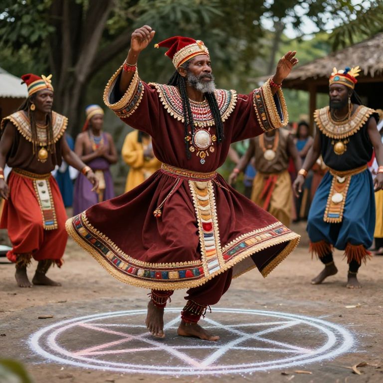 Magical Creatures witch doctor performing creole dance, ceremonial robe, pentacle in chalk on ground, hyperrealistic, hyperdetailed, GoogleDream style.,