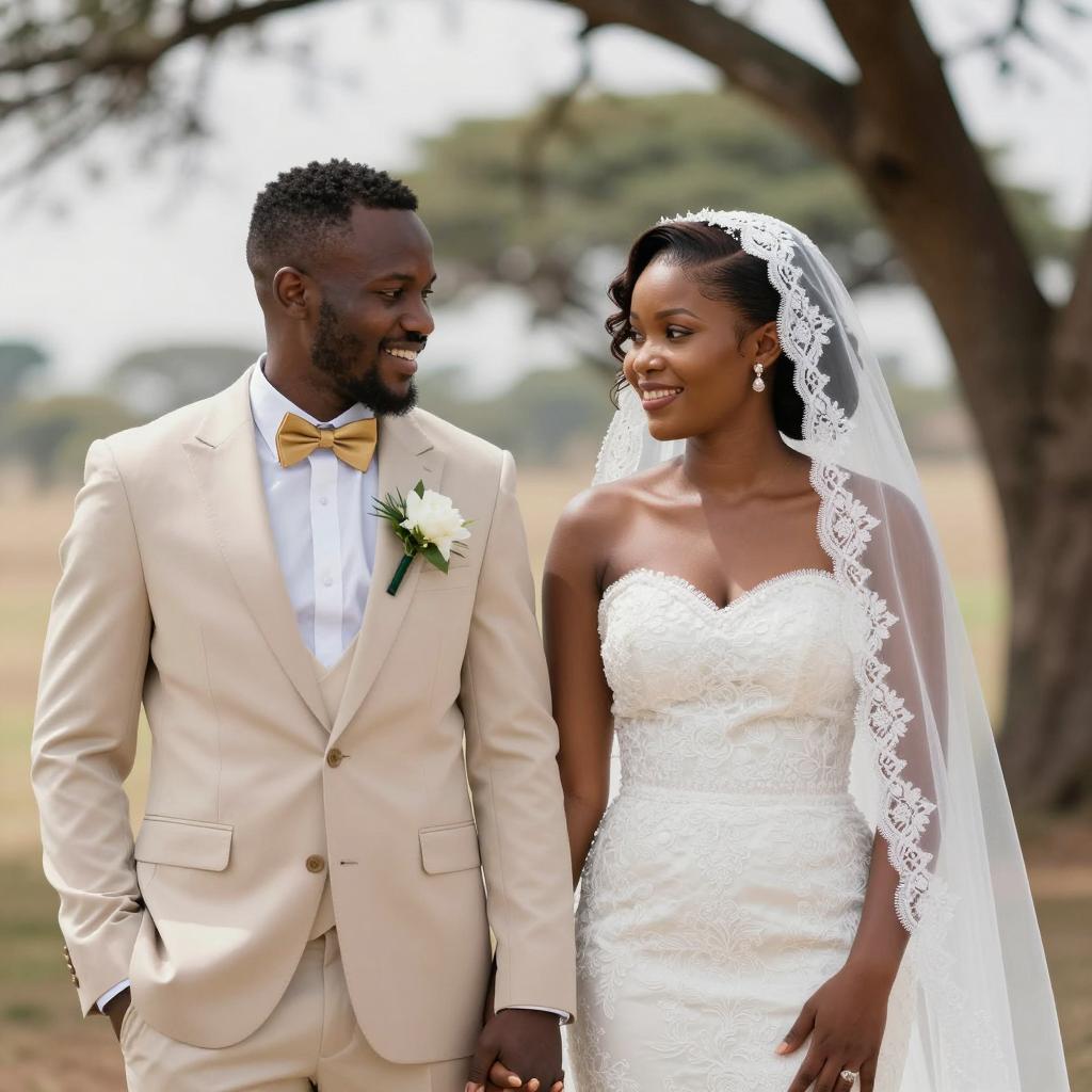 Nigerian male wedding attire, photorealistic, African-American man, standing, full body, looking at camera, wearing gray tuxedo, brown vest, white shirt, brown bow tie, pocket square, beige pants, short dark hair, handsome, strong jawline, neutral expression, soft light, blurred background with green plants and hanging lights, elegant, formal attire, modern fashion, nighttime, luxurious atmosphere, realistic ures, detailed clothing, fashionable, stylish, confident, medium close-up.