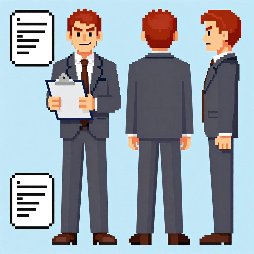 Pixel art of four identical male scientists with white hair, glasses, white lab coats, blue ties, and black pants, standing in a dark, futuristic