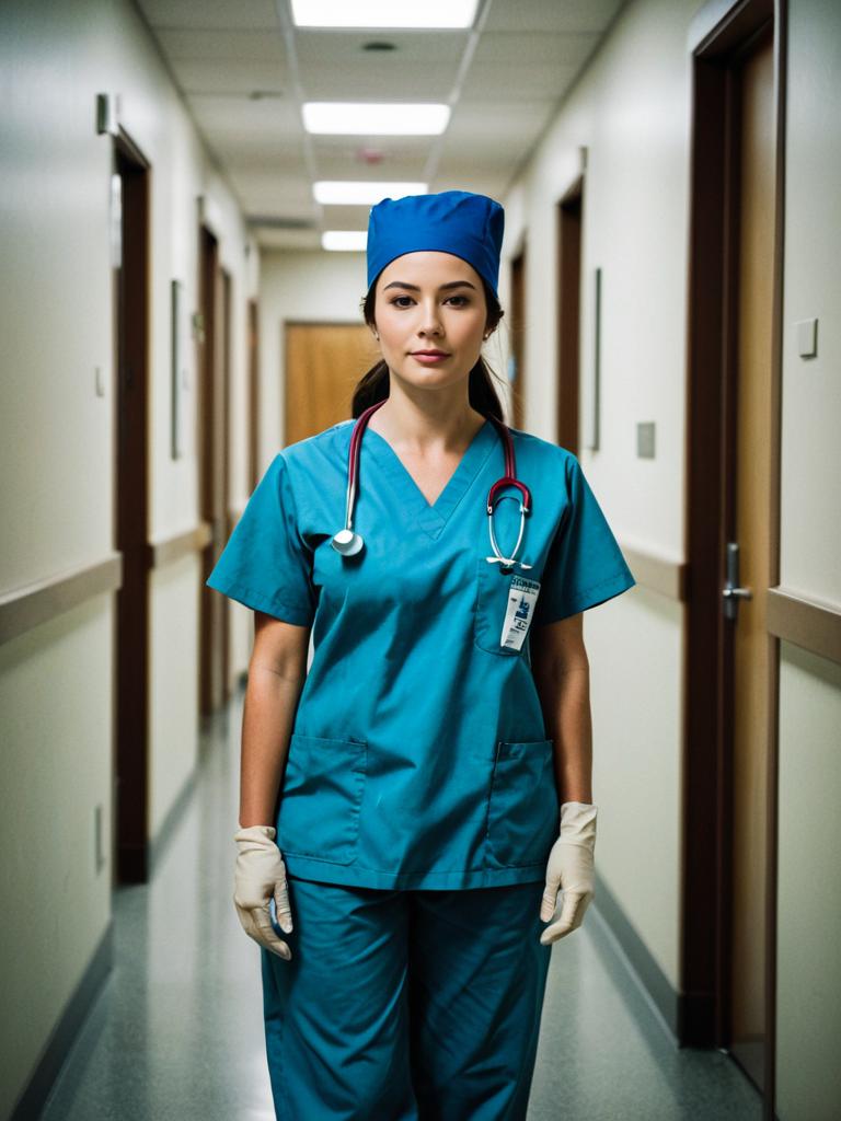 Scrubs Costume, woman in scrubs and a blue hat standing in a hallway