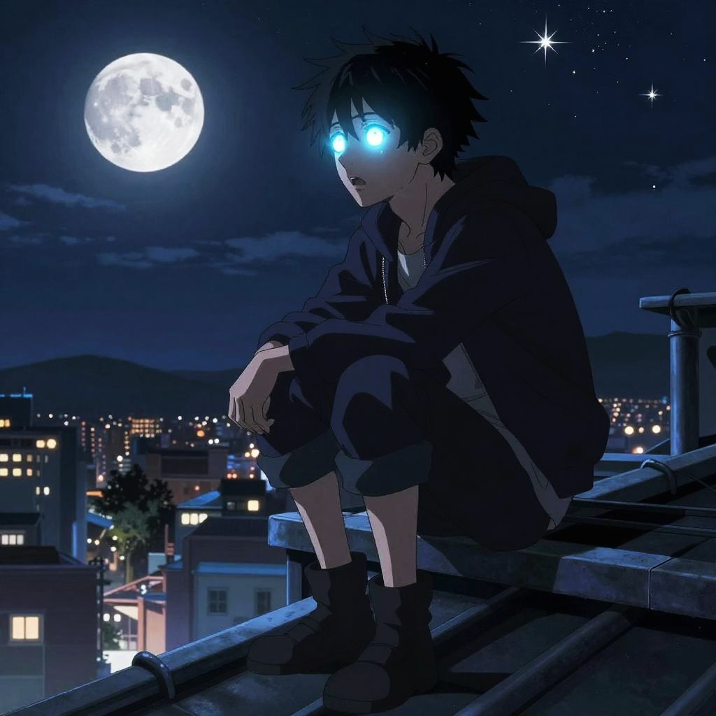 Iruma in a dramatic night scene, moonlit sky with sparkling stars, perched on a rooftop overlooking a mystical cityscape, his eyes glowing with magical energy, expressive anime art with rich textures and moody lighting.