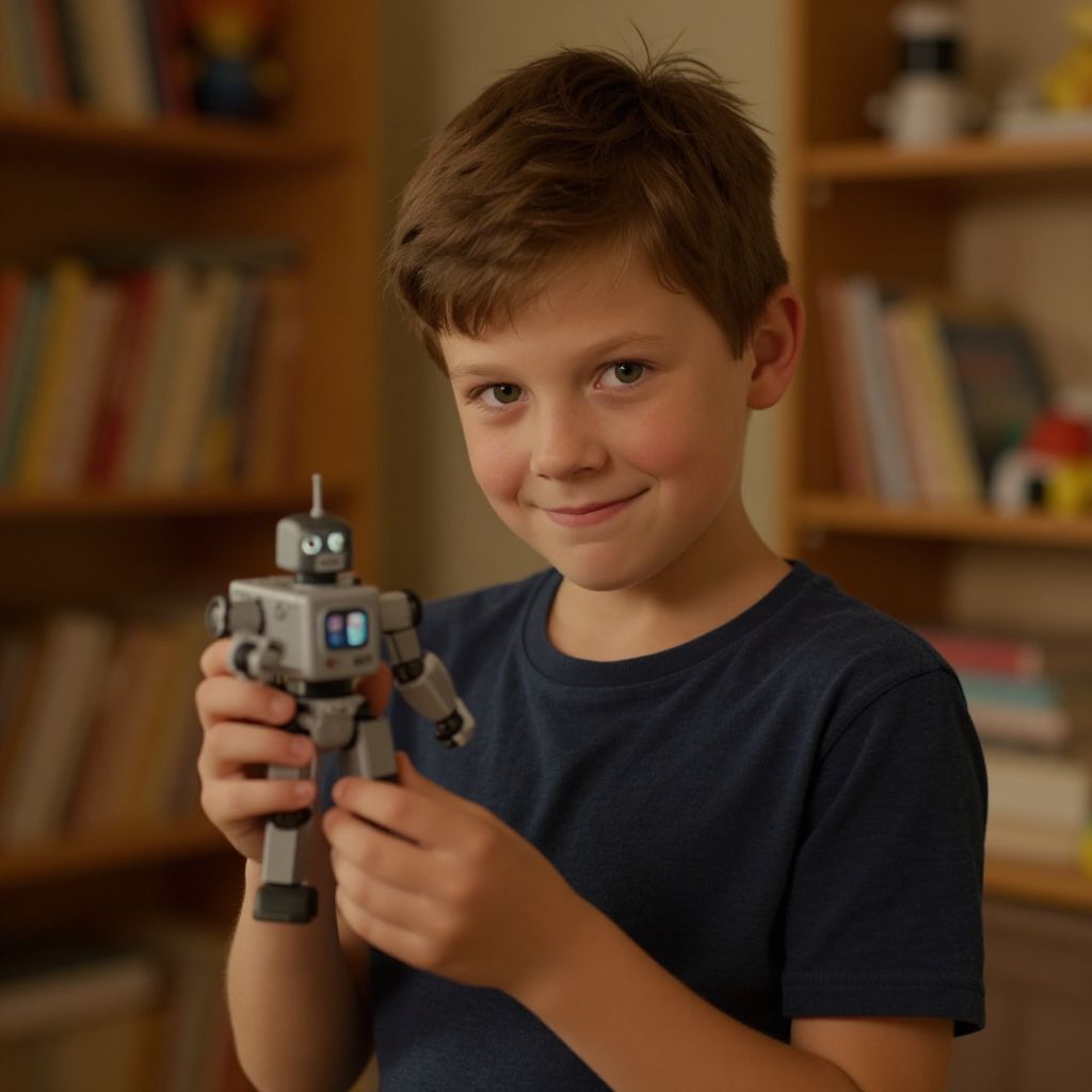 Kid smirking confidently while holding a small toy robot, indoor cozy room with warm ambient light, shelves filled with books and toys in the background, realistic textures on skin and clothes, expressive eyes and subtle smile captured in hyperrealistic style